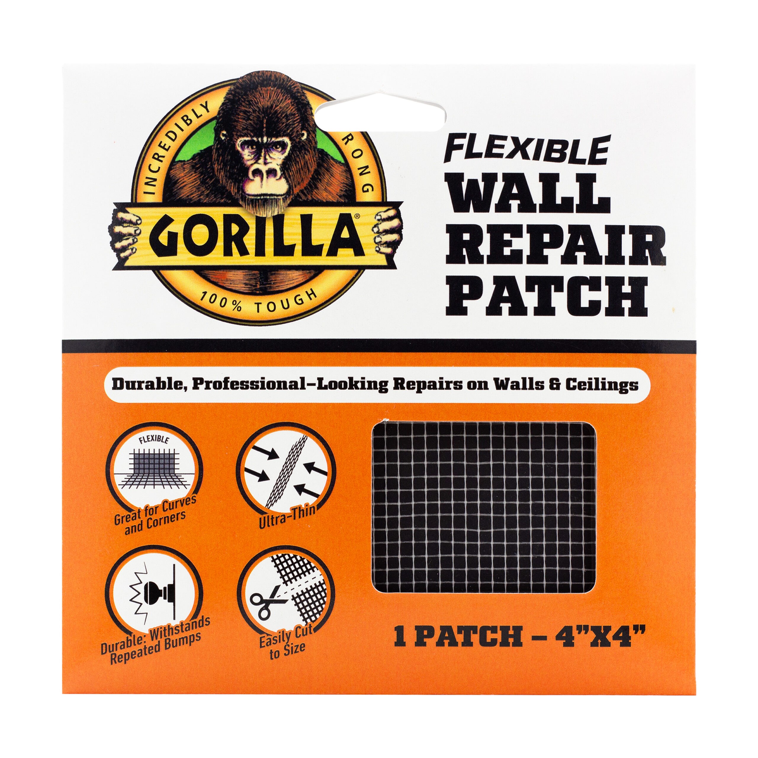 GORILLA FLEXIBLE WALL REPAIR PATCH - 4" X 4"Ultra-thin, self-adhering flexible rubber patch covers holes and damage in drywall and plaster. The flexible design works on curves and corners where rigid patches cannot, and it withstands repeated impacts without cracking.