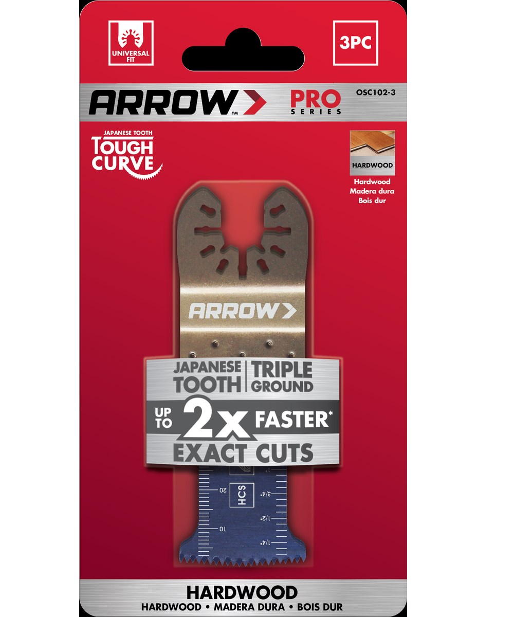 ARROW TOUGH CURVE OSCILLATING WOOD BLADE - 1-1/4", 3PKArrow ground tooth curve oscillating blade designed for fast, aggressive cuts in wood and construction materials. The Japanese tooth design with extended depth between teeth delivers up to 2X faster cutting than standard bi-metal blades. Universal-fit open back fits most oscillating multi-tool brands.