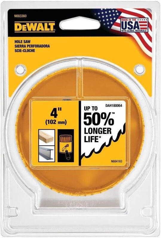 DEWALT BI-METAL HOLE SAW - 4"Cut clean holes in wood, metal, and plastic with this DeWalt 4" bi-metal hole saw. Features a high-speed steel cutting edge and patented tooth design that optimizes chip removal for efficient drilling and up to 50% longer life compared to prior generation models.