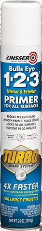 Zinsser Bulls Eye 1-2-3 Turbo Bright White Interior/Exterior Primer Spray is an all surface primer designed to block tough stains, seal odors and create a smooth finish for topcoat. Prime large objects in no time with a powerful spray that provides professional spray equipment results without the cleanup.