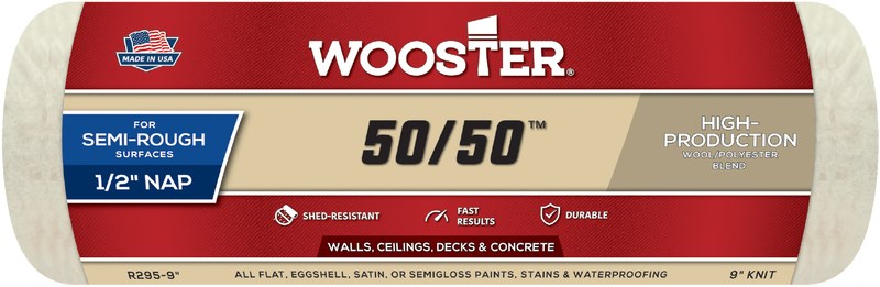 Shed-resistant, cream-colored, knit fabric blend of 50% lambswool and 50% polyester for 100% performance in all flat, satin or semigloss paints, stains, waterproofing