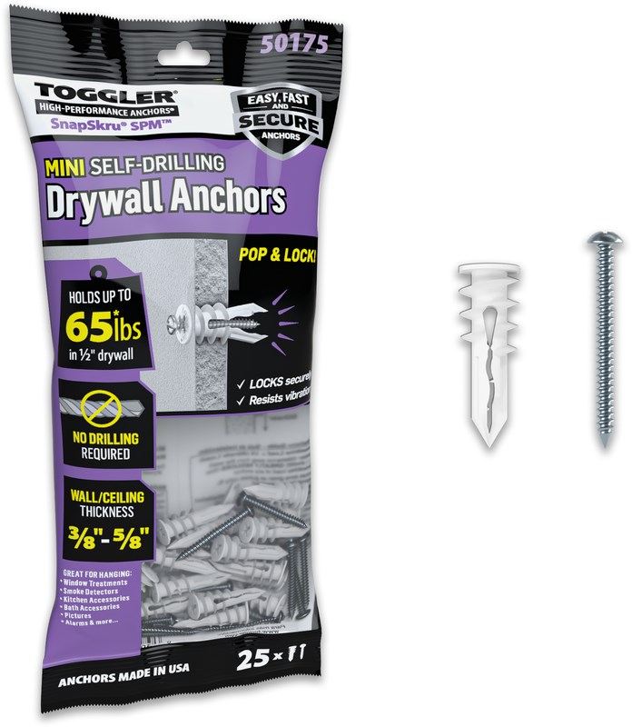 TOGGLER SNAPSKRU SPM MINI SELF-DRILLING DRYWALL ANCHORS - 25 PACKInstall shelves, mirrors, and fixtures in drywall without pre-drilling. The SnapSkru Mini creates only a tiny 1/4" hole and its small 0.4" diameter head hides behind fixtures for a clean look. Includes 25 anchors with #6 x 1-1/4" combo head screws.