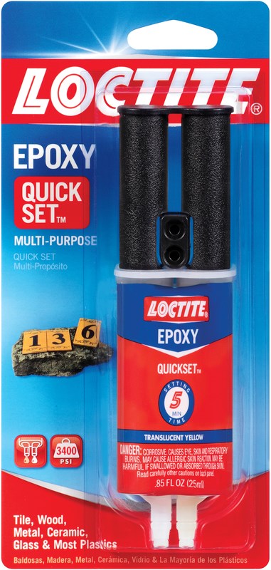 Loctite® Epoxy Quick Set™ is a two-part adhesive consisting of an epoxy resin and a hardener.  When mixed in equal volumes, the resin and hardener react to produce a tough, rigid, high strength bond in 5 minutes for most projects