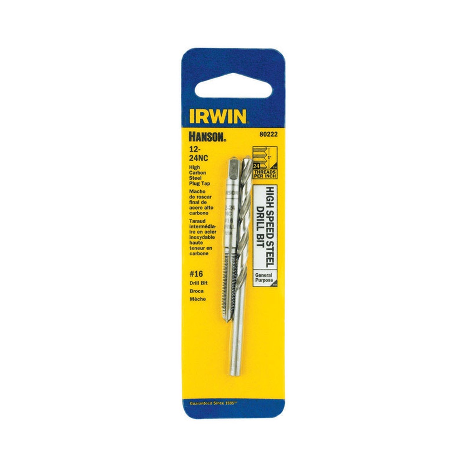 IRWIN TAP AND DRILL BIT SET - 12-24 NCIrwin tap and drill bit combo pack for creating machine screw threads. Includes a high carbon steel plug tap for general-purpose threading and a high-speed steel (HSS) drill bit sized for the correct tap drill hole. Having the matched set ensures proper thread fit every time.