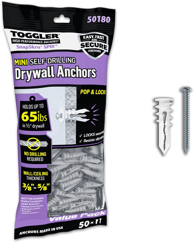 TOGGLER SNAPSKRU SPM MINI SELF-DRILLING DRYWALL ANCHORS - 50 PACKProfessional quantity of self-drilling drywall anchors for contractors and DIY projects. The SnapSkru Mini creates only a tiny 1/4" hole and features a small 0.4" diameter head that hides behind fixtures. This 50-pack contains anchors only - screws sold separately.