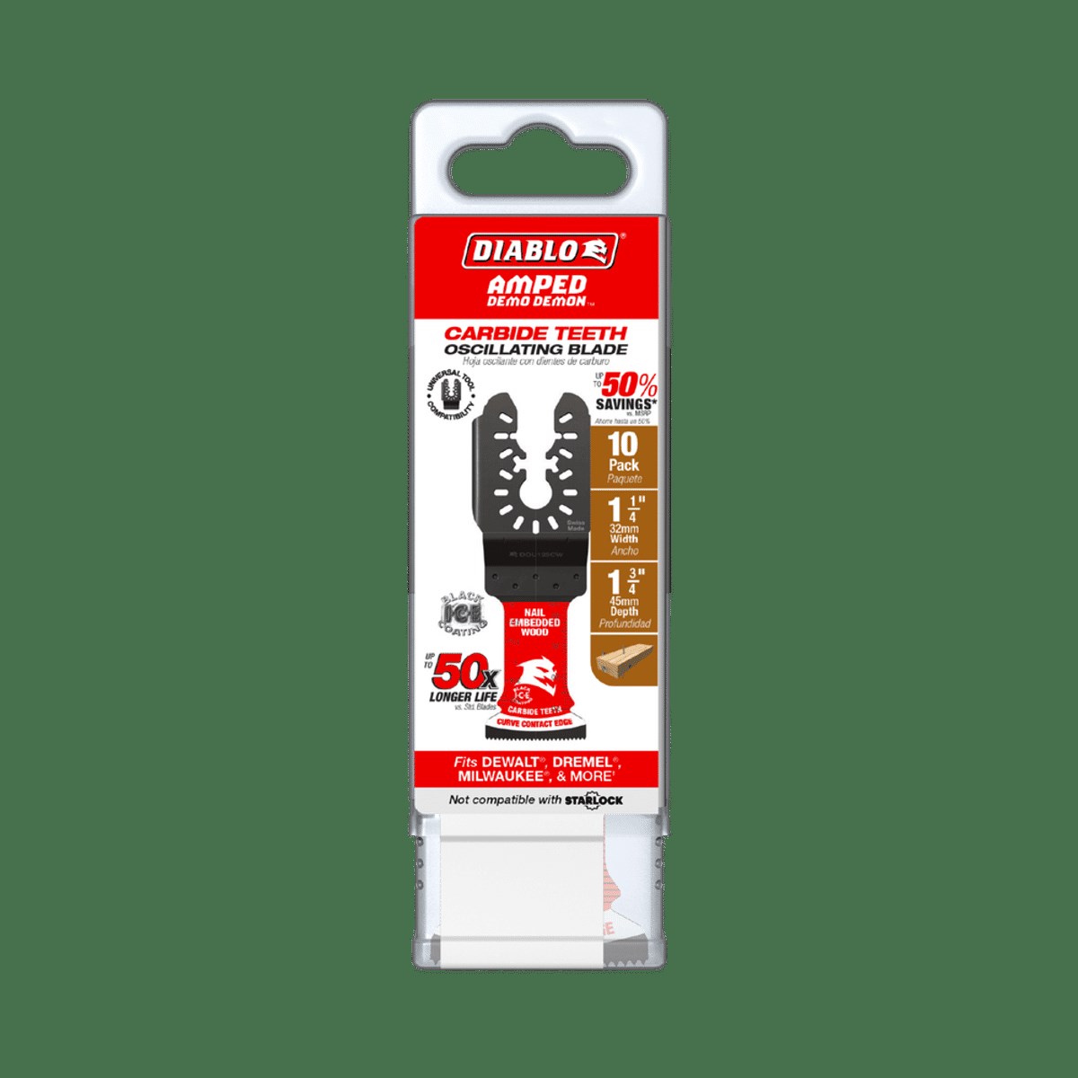 DIABLO DEMO DEMON AMPED CARBIDE OSCILLATING BLADE - 1-1/4", 10-PACKStock up with this 10-pack of Diablo Demo Demon Amped carbide oscillating blades. Featuring high-performance carbide teeth with a tapered tooth design that eliminates friction, these blades tackle the toughest demolition and remodeling tasks involving nail-embedded wood.