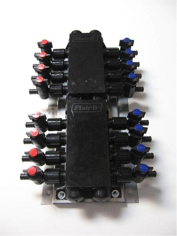 FLAIR-IT PEX MANIFOLD WITH ECOPOLY VALVES - 19 PORTThe Flair-It PEX manifold simplifies plumbing installations with a modular, tool-free design that requires no crimping. Built from durable PPSU (polyphenylsulfone) with 19 integrated Ecopoly shut-off valves, this manifold features a 1" internal chamber for maximum water flow and 1/2" MPT outlets for easy connection to PEX A, PEX B, and PERT piping systems.