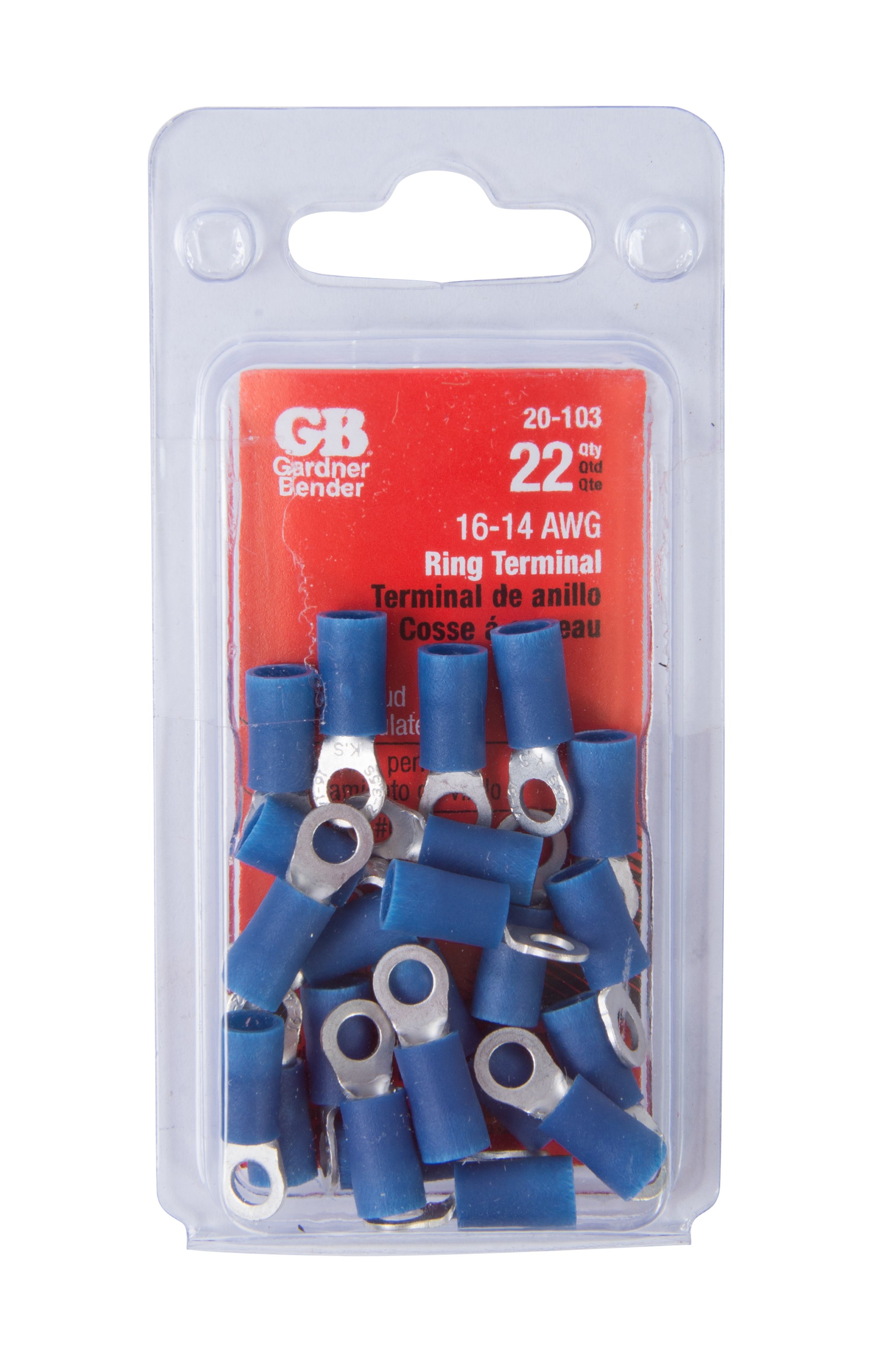 GARDNER BENDER VINYL INSULATED RING TERMINALS - BLUE, 16-14 AWGGardner Bender vinyl insulated ring terminals provide quick, reliable crimp-type wire connections for electrical wiring projects. Color-coded blue for easy identification of 16-14 AWG wire gauge compatibility. The vinyl insulated barrel protects against short circuits and accidental contact.