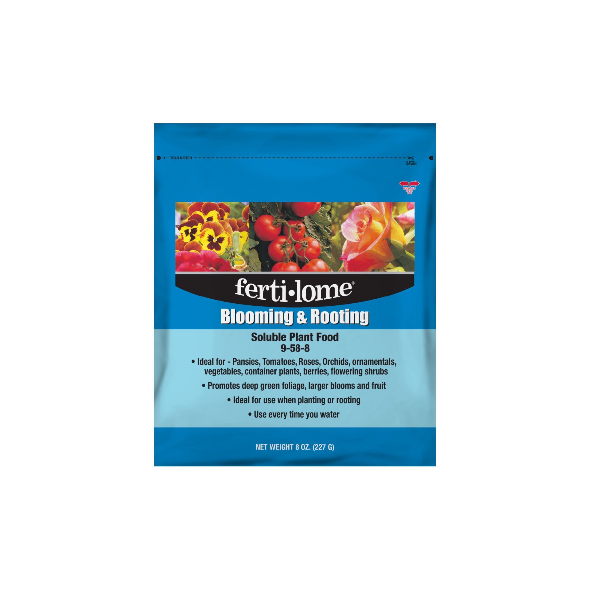 FERTILOME BLOOMING & ROOTING SOLUBLE PLANT FOODHighly concentrated, water-soluble powder plant food formulated to promote vigorous blooming, strong root development, and larger blooms. The chlorine-free 9-58-8 formula delivers a high phosphorus ratio to encourage flowering and root growth in a wide variety of plants.