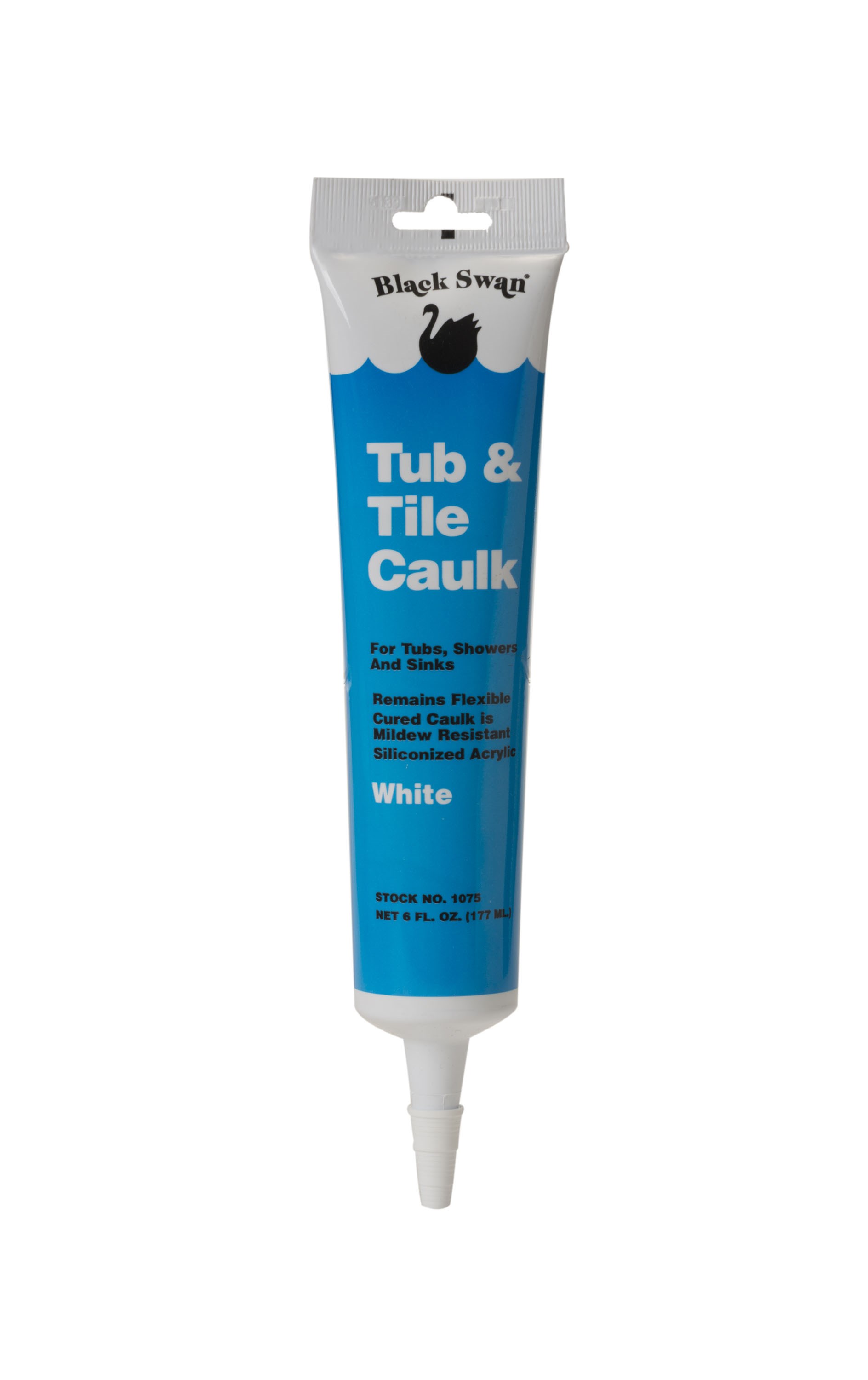 BLACK SWAN TUB & TILE CAULK - WHITE, 6 OZSiliconized acrylic latex caulk for tub, tile, and general sealing applications. Provides primerless adhesion to ceramic tile, glass, aluminum, wood, concrete, and brick. Mildew resistant and waterproof formula with non-yellowing white finish for lasting protection in wet areas.