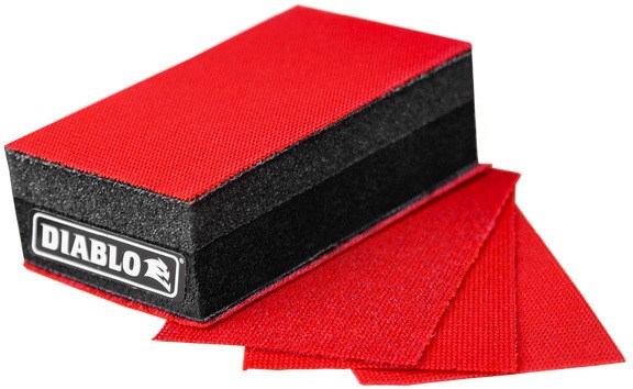 DIABLO REUSABLE HAND SANDING BLOCK - 3-2/3" x 9"The Diablo Reusable Hand Sanding Block features a dual-sided foam design for versatile hand sanding. One side has cushioned foam for controlled material removal on flat and contoured surfaces, while the dense foam side provides more aggressive material removal. The Hook and Lock backing system accepts SandNET sanding sheets for a clog-reducing, long-lasting sanding solution.