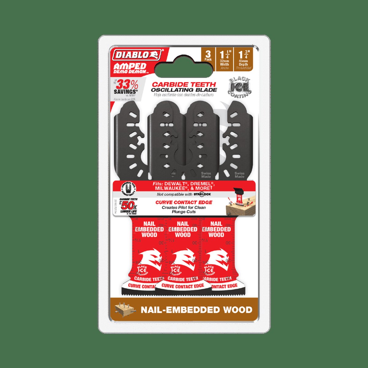 DIABLO DEMO DEMON AMPED CARBIDE OSCILLATING BLADE - 1-1/4", 3-PACKThis 3-pack of Diablo Demo Demon Amped carbide oscillating blades features high-performance carbide teeth with a tapered tooth design that eliminates friction. Built for demanding demolition and remodeling tasks involving nail-embedded wood.