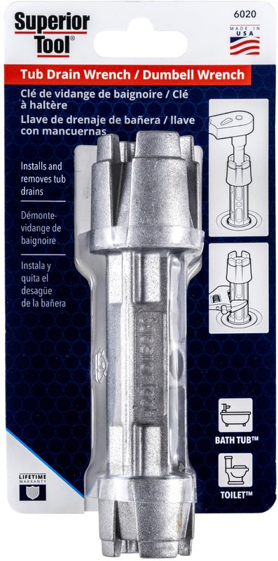 SUPERIOR TOOL TUB DRAIN WRENCHThe Superior Tool tub drain wrench (6020) makes installing and removing tub drains easy without scratching fine finishes. This heavy-duty die cast aluminum tool works on drains with or without crossbars, including Kohler and American Standard fixtures.