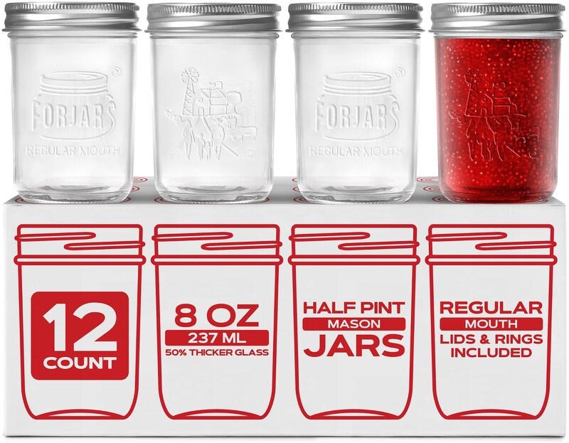 FORJARS 8 OZ REGULAR MOUTH MASON JARS - 12 PACKPremium half-pint glass canning jars from Forjars, perfect for preserving jams, jellies, sauces, and other pourable foods. These 8 oz jars feature thick, lead-free glass that is canner safe for both water bath and pressure canning.