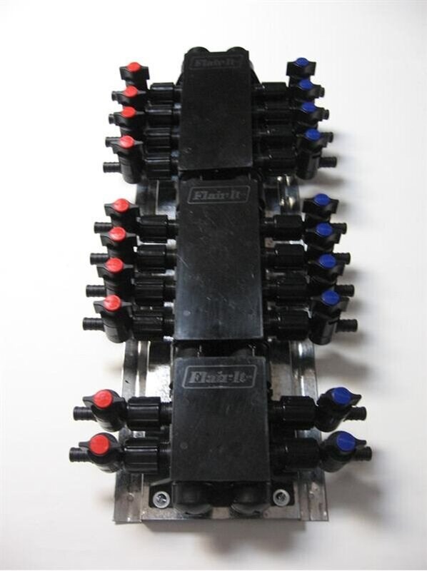 FLAIR-IT PEX MANIFOLD WITH ECOPOLY VALVES - 20 PORTThe Flair-It PEX manifold simplifies plumbing installations with a modular, tool-free design that requires no crimping. Built from durable PPSU (polyphenylsulfone) with 20 integrated Ecopoly shut-off valves, this manifold features a 1" internal chamber for maximum water flow and 1/2" MPT outlets for easy connection to PEX A, PEX B, and PERT piping systems.