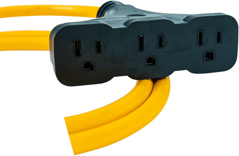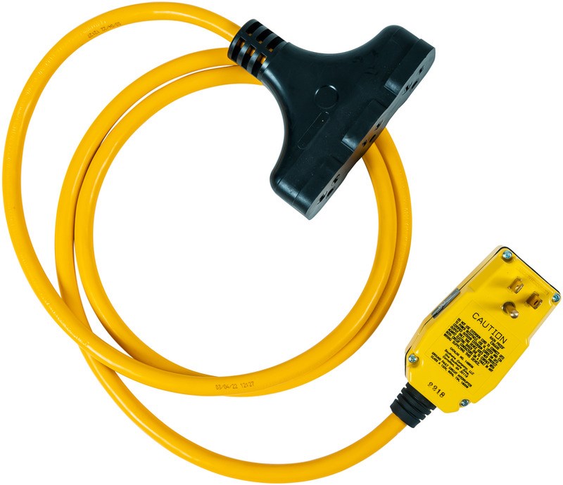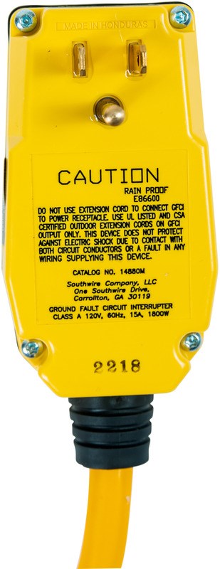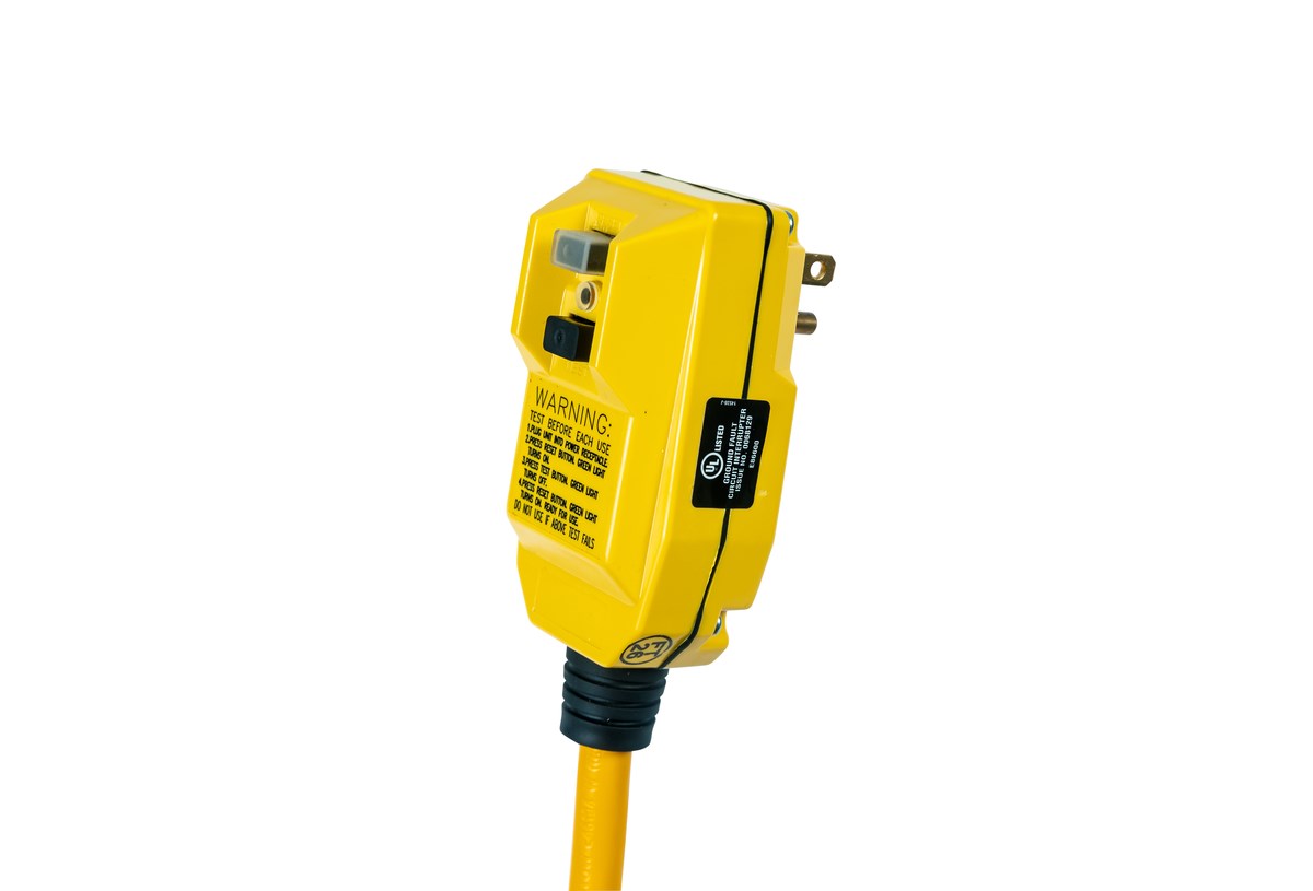 COLEMAN CABLE 12/3 SJTW GFCI TRI-TAP CORD - 6 FTHeavy-duty 12-gauge GFCI tri-tap cord for jobsite and outdoor power. The Ground Fault Circuit Interrupter is built into the molded male plug and provides personnel protection for the cord and up to three connected tools. The 6-foot 12/3 SJTW yellow cord ends in a three-outlet tap, delivering 15 amps of power with rain-proof performance.