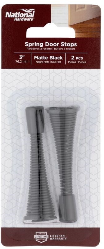 NATIONAL HARDWARE V232 SPRING DOOR STOP - MATTE BLACK, 2-PACKProtect your walls from door damage with this National Hardware V232 spring door stop. The flexible steel spring absorbs impact when a door swings open, while the rubber bumper tip prevents marks on walls and doors. Surface-mounted design with a wide base provides sturdy spring support. Value 2-pack for outfitting multiple doors.