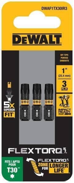 DEWALT FLEXTORQ TORX T30 INSERT BIT - 1", 3PKImpact-rated insert bit engineered with DeWalt FlexTorq technology for superior durability in impact drivers. The engineered flex zone absorbs impact energy for up to 200 times longer bit life, while the CNC-machined Torx T30 tip provides a precise fit and reduces cam-out.