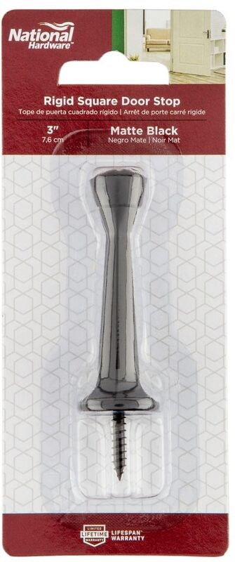 NATIONAL HARDWARE RIGID SQUARE DOOR STOP - 3" MATTE BLACKProtect your walls and molding from door damage with this zinc die-cast rigid door stop. The surface-mount design installs easily on baseboards with the included mounting hardware.
