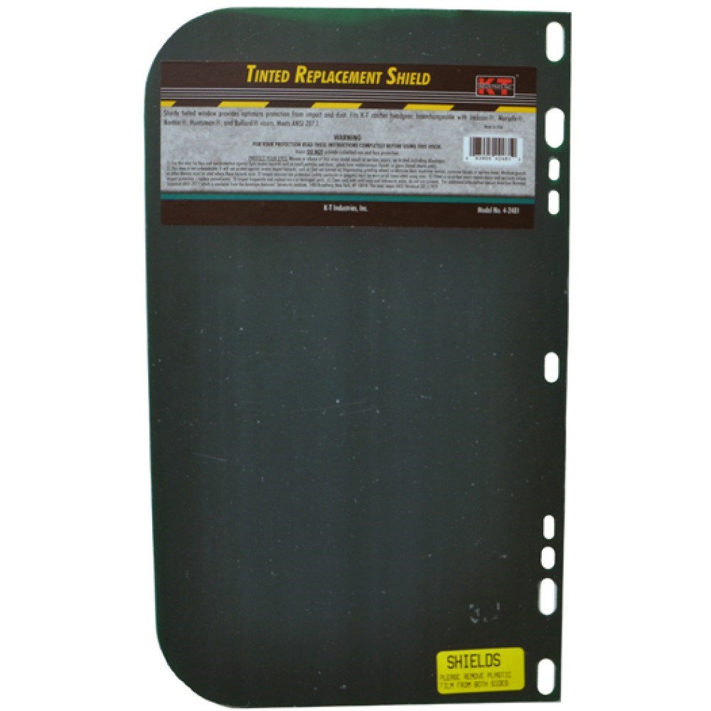K-T INDUSTRIES GREEN FACE SHIELD - 9" x 15-1/2"This K-T Industries green replacement face shield provides reliable impact and dust protection with added glare reduction for grinding, cutting, chipping, and general industrial work. The green tint reduces bright light from sparks and hot metal. The shield is bound with aluminum edging for easy molding to fit your headgear, and it is interchangeable with most major brand face shield systems.