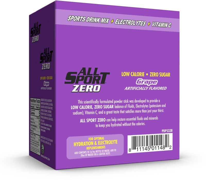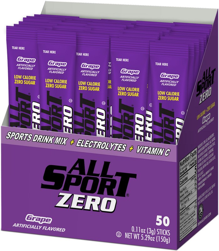 ALL SPORT ZERO POWDER HYDRATION STICKS - GRAPE, 50-PACKAll Sport Zero Powder Sticks are a zero-sugar electrolyte drink mix designed to keep you hydrated during workouts, outdoor work, and heat-stress environments. Each stick delivers 2X the potassium and half the sodium of leading sports drinks, with only 5 calories per serving.