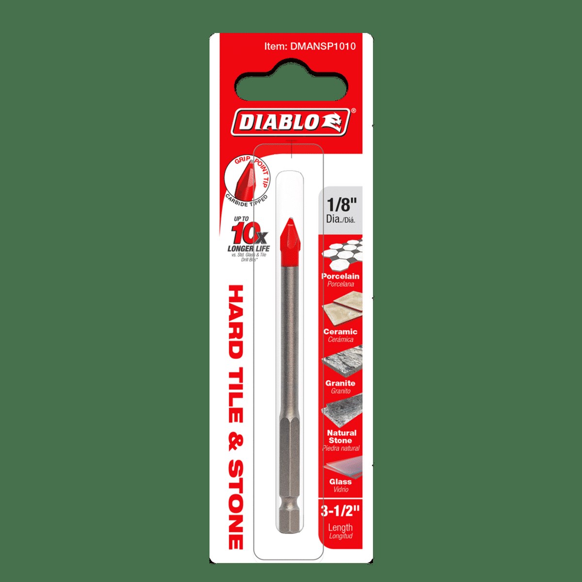 DIABLO HARD TILE & STONE CARBIDE DRILL BIT - 1/8"The Diablo 1/8" Hard Tile & Stone Carbide Tipped Drill Bit delivers faster starts and up to 10X longer life versus standard glass and tile drill bits. The asymmetric tip design and multi-ground carbide Grip Point tip produce clean holes with reduced wander in hard materials.