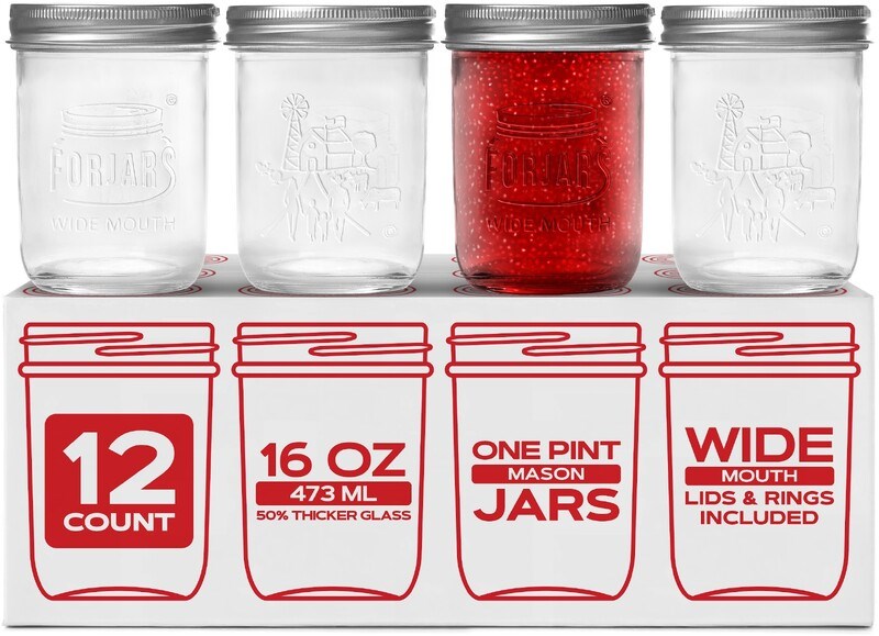 FORJARS 16 OZ WIDE MOUTH MASON JARS 12 PACKPremium pint-size glass canning jars from Forjars with wide mouth opening for easy filling and scooping. These 16 oz jars feature thick, lead-free glass that is canner safe for water bath and pressure canning methods.