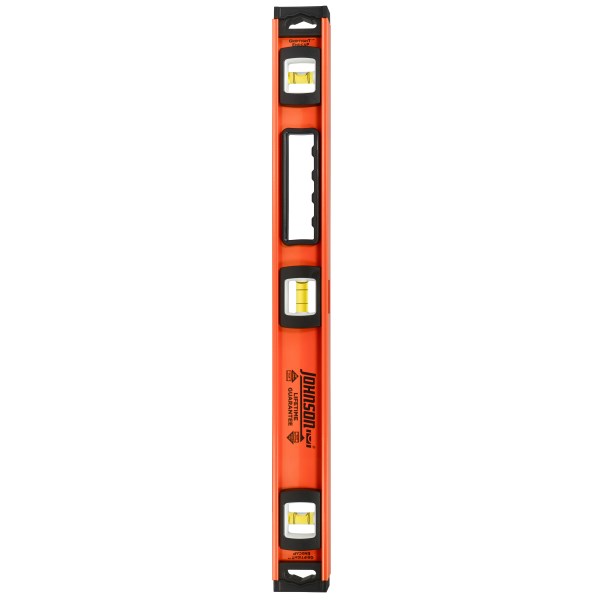 JOHNSON HEAVY DUTY I-BEAM ALUMINUM LEVEL - 24"The Johnson heavy-duty I-beam aluminum level delivers accurate readings with oversized 1/2" diameter vials and SurroundView technology that reflects ambient light for better visibility. Ergonomic cushioned hand grips and removable end caps make this level comfortable and versatile for finish carpentry, cabinetry, and general construction.