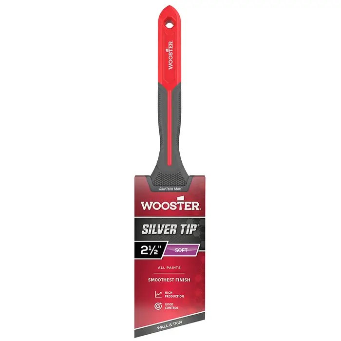 WOOSTER SILVER TIP GRIPTECH MAX BRUSH - 2-1/2"Premium angular sash brush with Wooster's Griptech composite handle for a secure, comfortable grip. The Silver Tip filaments deliver the smoothest finish with excellent coverage on all paint types.