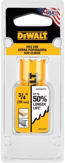 DEWALT BI-METAL HOLE SAW - 3/4"Cut clean holes in wood, metal, and plastic with this DeWalt 3/4" bi-metal hole saw. Features a high-speed steel cutting edge and patented tooth design that optimizes chip removal for efficient drilling and up to 50% longer life compared to prior generation models.