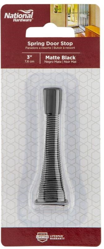Protect your walls and door handles with this 3" spring door stop from National Hardware. The flexible steel spring absorbs impact while the rubber bumper tip cushions contact to prevent scuffs and dents.