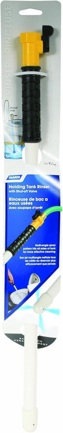RV HOLDING TANK RINSER WITH SHUTOFF VALVEKeep your RV's black water holding tank clean and odor-free with this Camco tank rinser. The built-in quarter-turn shutoff valve gives you complete control of water flow while flushing, and the side-placed jets reach even the smallest and hardest-to-reach areas inside the tank.
