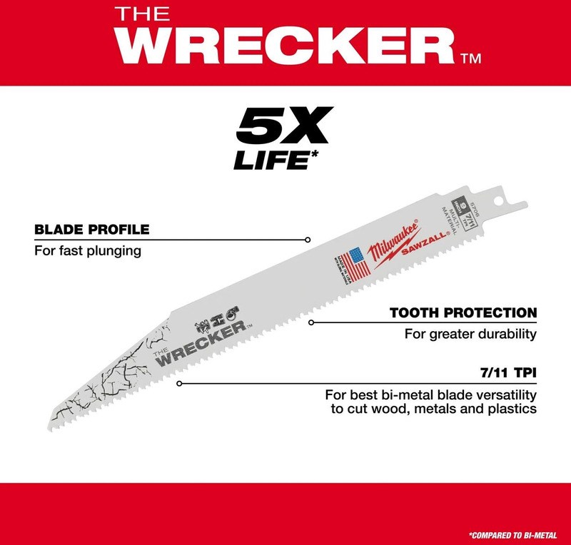 The Wrecker is ideal for general purpose demolition cutting. It will deliver exceptional durability in a wide range of materials, including ferrous and non-ferrous metals, plastics, and nail-embedded wood.All-purpose demolition blade!