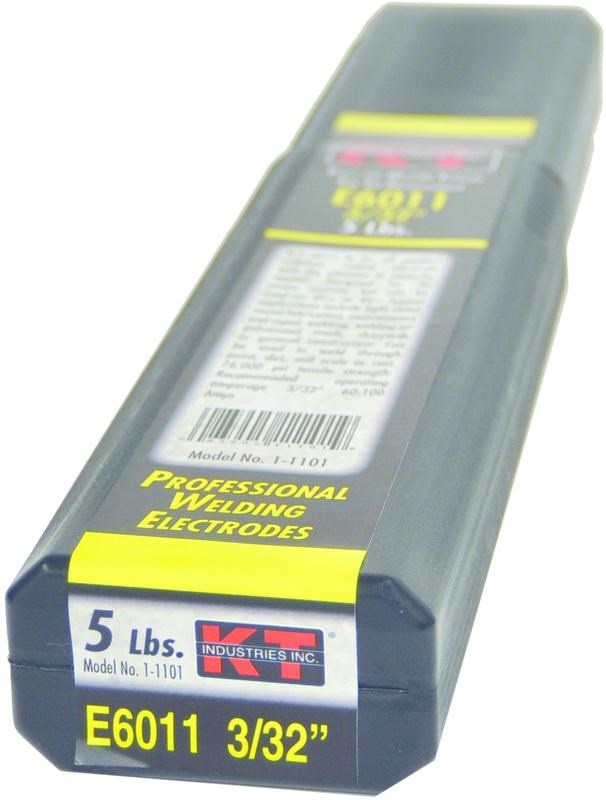 K-T INDUSTRIES AWS E6011 WELDING ELECTRODE - 3/32" 5 LBThe K-T Industries E6011 is an all-position cellulose-coated stick welding electrode designed for AC, DC+, and DC- power sources. Its strong arc force and rapid solidification make it ideal for vertical and overhead welding on maintenance and repair jobs.