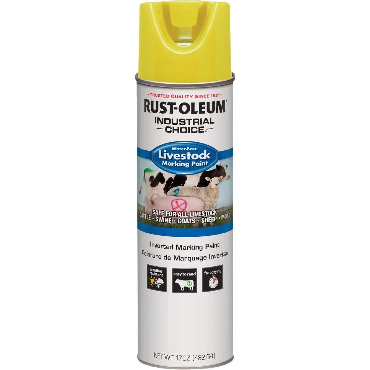 RUST-OLEUM LIVESTOCK MARKING SPRAY PAINTIndustrial Choice water-based livestock marking paint provides bright, highly visible markings that are safe for all livestock. The fade-resistant formula lasts up to 30 days and creates vivid markings without irritating the animal's skin.