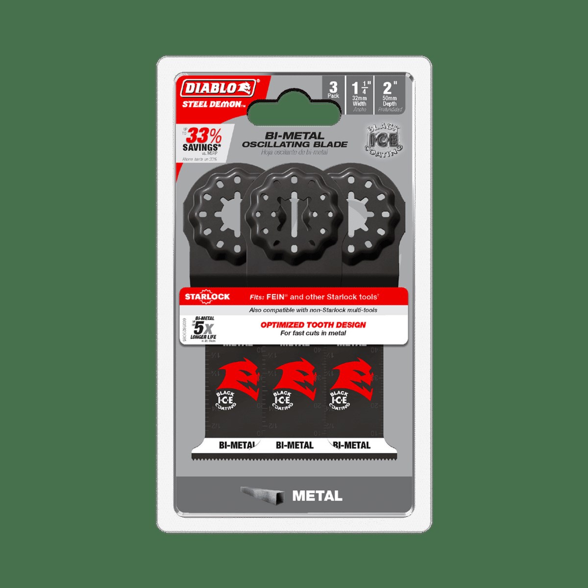 DIABLO STEEL DEMON STARLOCK BI-METAL OSCILLATING BLADE - 1-1/4", 3PKThe Diablo Steel Demon 1-1/4" Starlock Bi-Metal Oscillating Blade delivers precision metal cutting with up to 5X longer life than standard blades. The ultra-hardened cutting edge and 2" cutting depth make it ideal for cutting through metal in tight spaces.