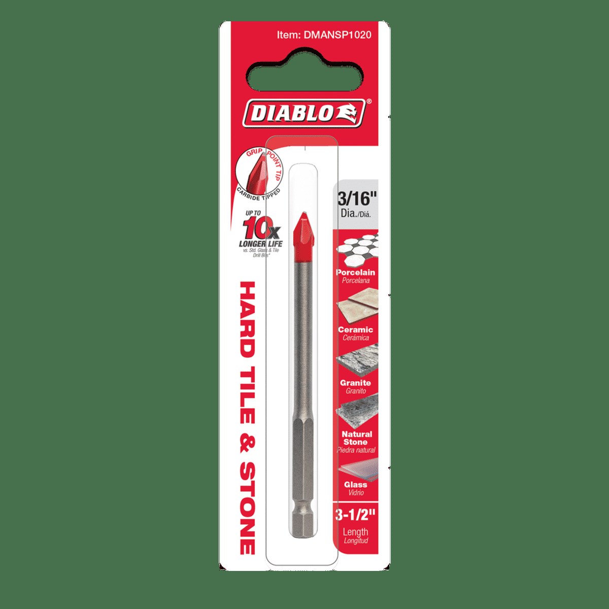 DIABLO HARD TILE & STONE CARBIDE DRILL BIT - 3/16"The Diablo 3/16" Hard Tile & Stone Carbide Tipped Drill Bit delivers faster starts and up to 10X longer life versus standard glass and tile drill bits. The asymmetric tip design and multi-ground carbide Grip Point tip produce clean holes with reduced wander in hard materials.