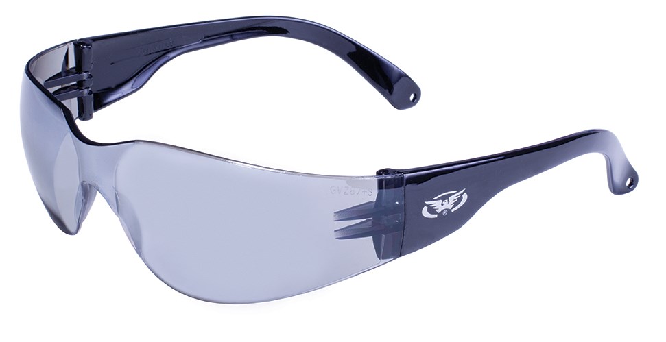 The Global Vision Rider FM Safety Glasses deliver full eye protection with a sleek, sporty design. The one-piece polycarbonate lens features a flash mirror coating for outdoor glare reduction while UV 400 protection blocks 99.9% of harmful ultraviolet radiation. The scratch-resistant coating keeps lenses clear after repeated use, and the black temples provide a comfortable, secure fit.