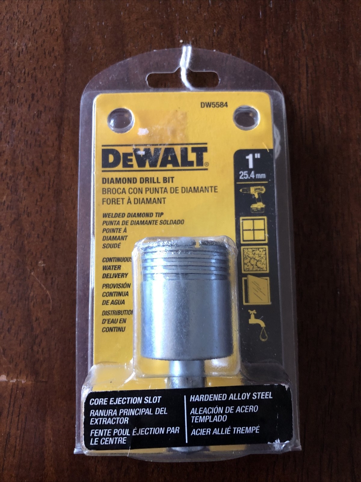 DEWALT DIAMOND DRILL BIT - 1"The DeWalt DW5584 Diamond Drill Bit powers through the densest, most abrasive tiles with precision. The ultra-durable diamond-welded tip delivers extreme durability and significantly outlasts conventional masonry bits when drilling through glazed ceramic, solid-body porcelain, and other dense tile materials. The 1" diameter handles larger holes for plumbing and electrical rough-ins in tile installations.