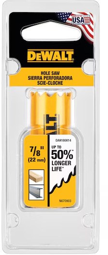 DEWALT BI-METAL HOLE SAW - 7/8"Cut clean holes in wood, metal, and plastic with this DeWalt 7/8" bi-metal hole saw. Features a high-speed steel cutting edge and patented tooth design that optimizes chip removal for efficient drilling and up to 50% longer life compared to prior generation models.