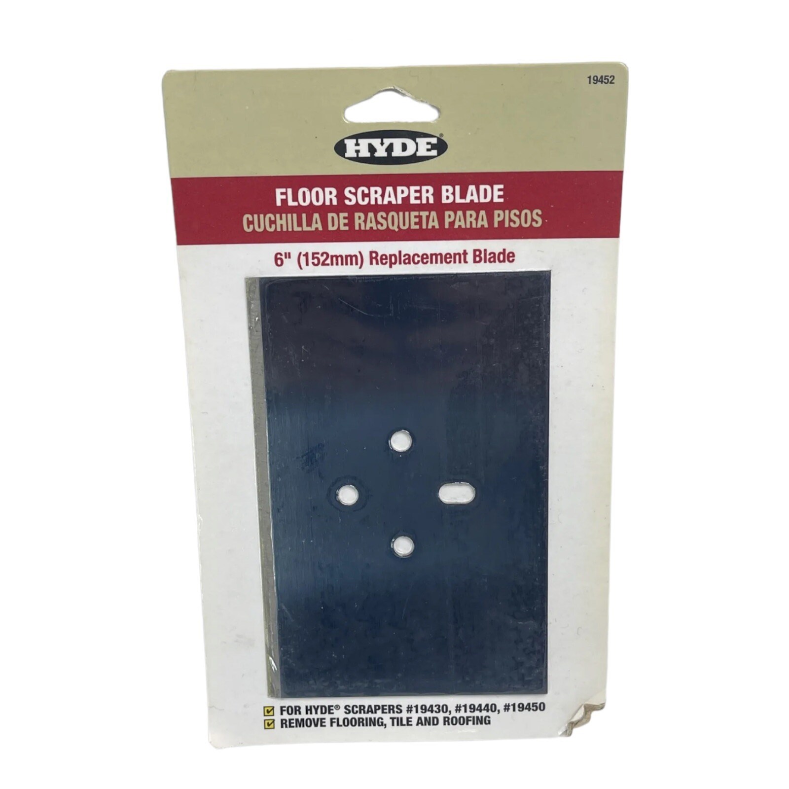 HAMMER SCRAPER REPLACEMENT BLADE - 6"Hyde replacement blade for hammer scrapers. High carbon steel construction with two sharpened edges provides long-lasting performance. Blades can be resharpened for extended use.
