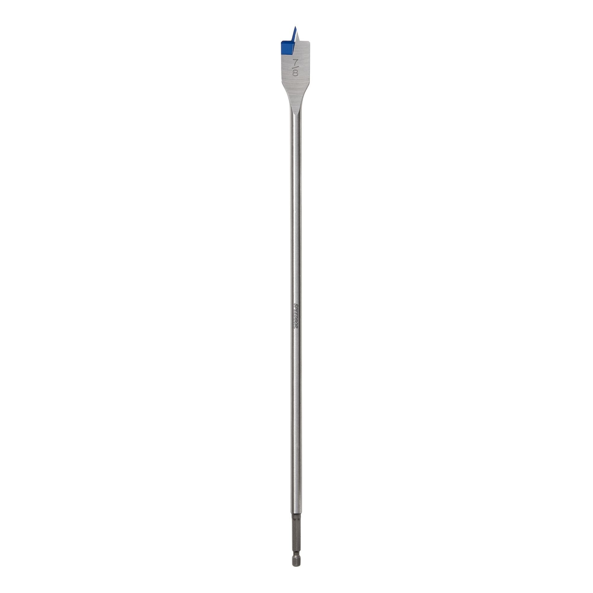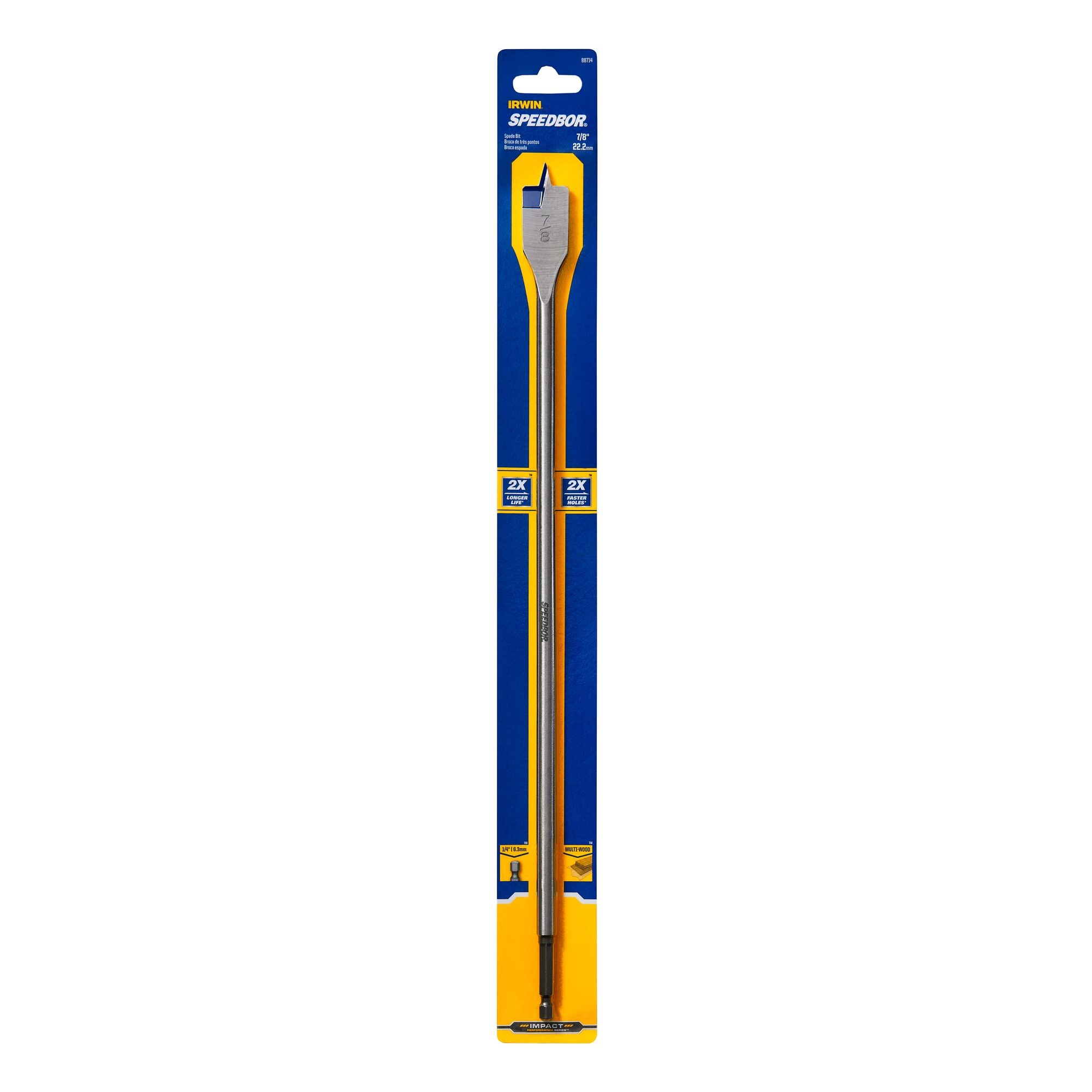 IRWIN SPEEDBOR 88XL EXTRA-LONG WOOD BORING BIT - 7/8"Extra-long 16" spade bit with patented Blue-Groove design for fast chip removal. Carbon steel construction with reinforced hex shank for use with drills and impact drivers.