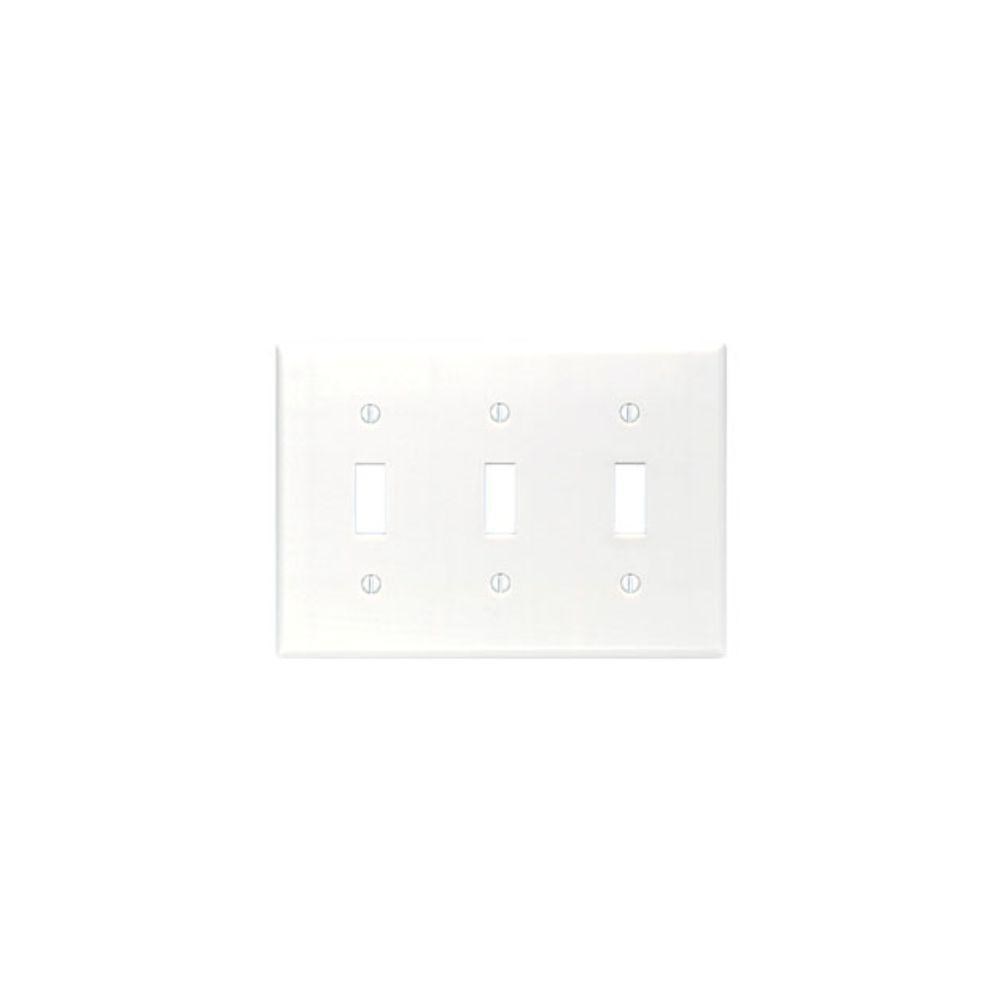 LEVITON 3-GANG TOGGLE SWITCH WALL PLATEThe Leviton 88011 is a standard-size 3-gang wall plate designed for three toggle switches. Made from durable white thermoset plastic with a smooth finish that complements any decor.