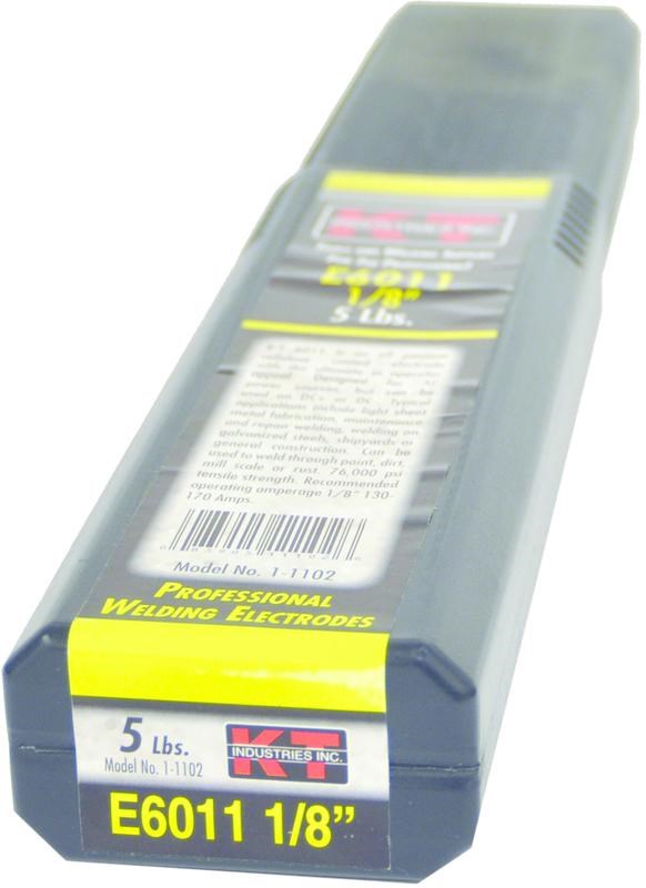 K-T INDUSTRIES AWS E6011 WELDING ELECTRODE - 1/8" 5 LBThe K-T Industries E6011 is an all-position cellulose-coated stick welding electrode designed for AC, DC+, and DC- power sources. The 1/8" diameter is the most popular size, suitable for a wide range of metal thicknesses. Its strong arc force and rapid solidification make it ideal for vertical and overhead welding.