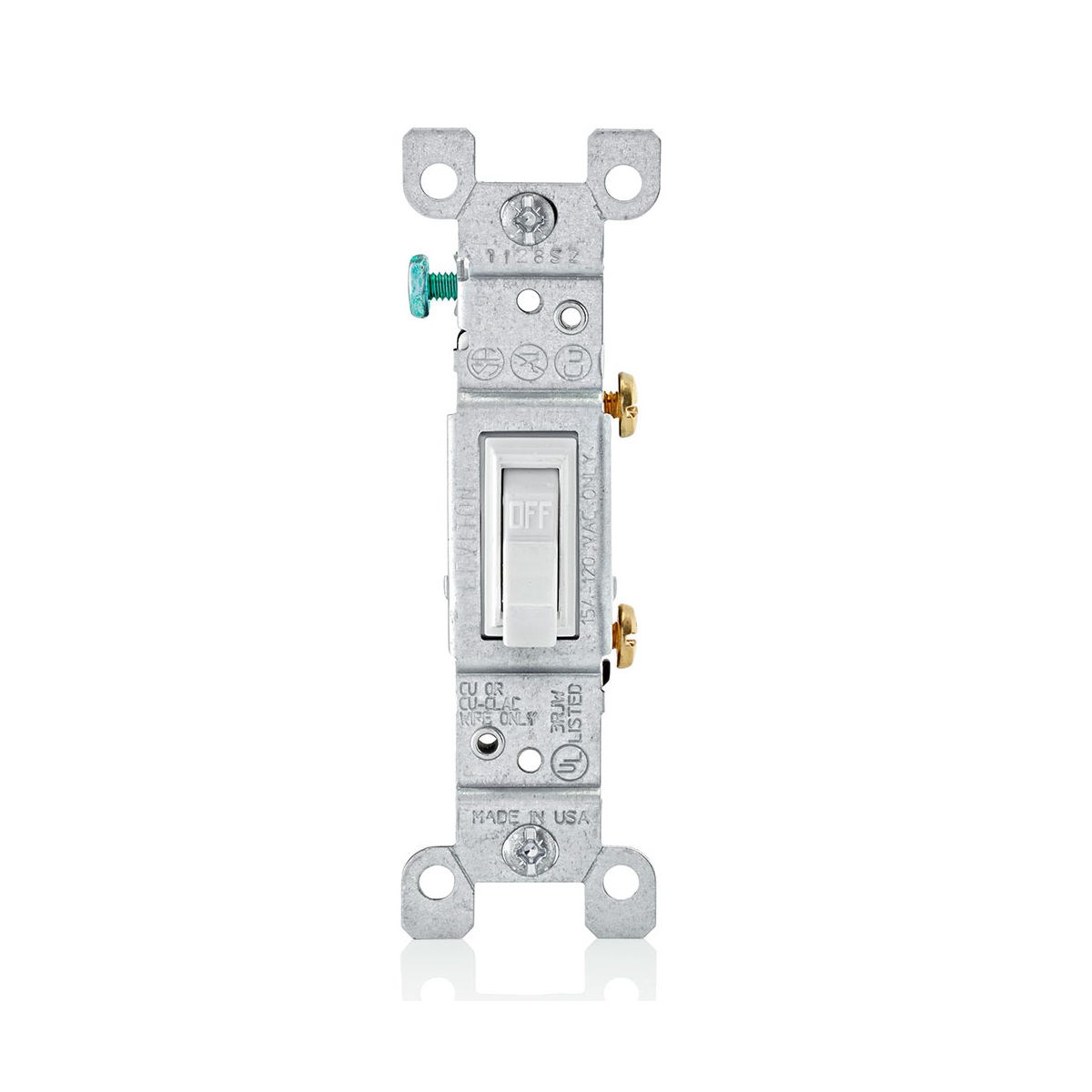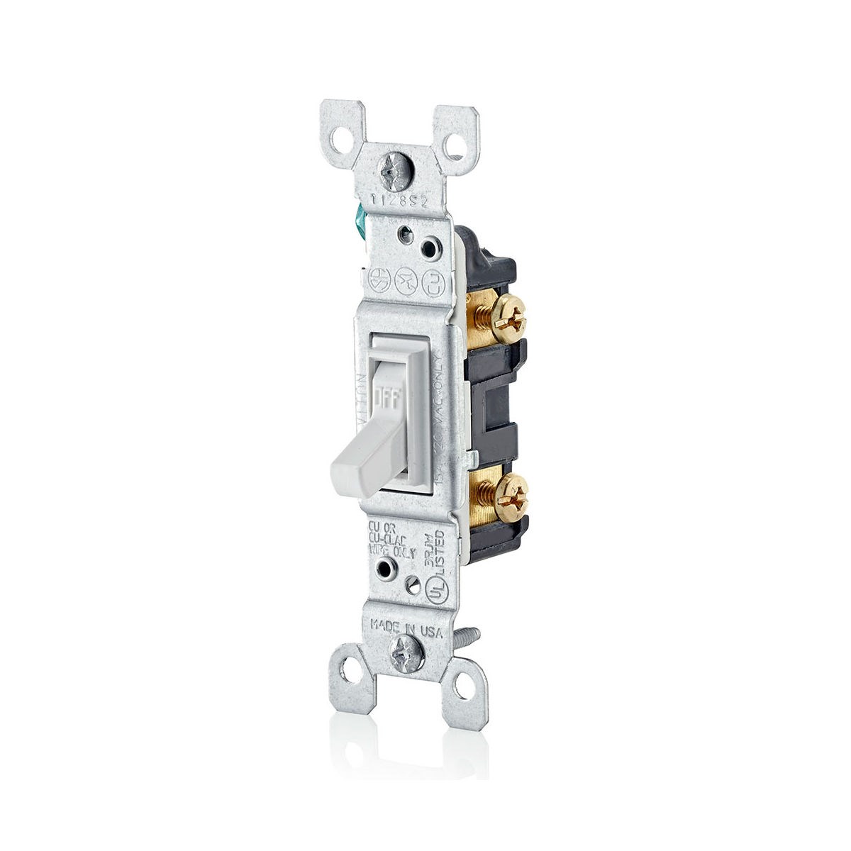 LEVITON 15 AMP SINGLE-POLE QUIET TOGGLE SWITCH - WHITEThe Leviton 1451 residential-grade single-pole AC quiet toggle switch is rated at 15 amps and 120 volts. Features grounding capability, Quickwire push-in and side-wired terminals, and impact-resistant thermoplastic construction.