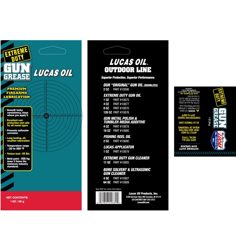 LUCAS EXTREME DUTY GUN GREASE - 1 OZLucas Extreme Duty Gun Grease provides long-lasting lubrication and corrosion protection for all firearm types. The smooth, tacky consistency stays where applied and withstands extreme pressure, heat, and friction during sustained firing. Apply to metal surfaces and bores to prevent corrosion during long-term storage.