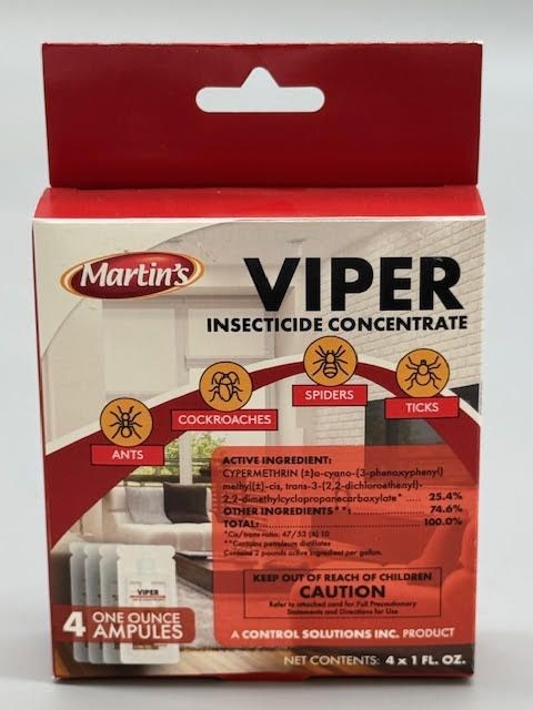 MARTIN'S VIPER INSECTICIDE CONCENTRATE - 4 OZMartin's Viper is a professional-grade emulsifiable concentrate with 25.4% Cypermethrin for long-lasting residual control of a wide range of pests. This 4 oz bottle provides enough concentrate for multiple applications when mixed with water at recommended dilution rates.