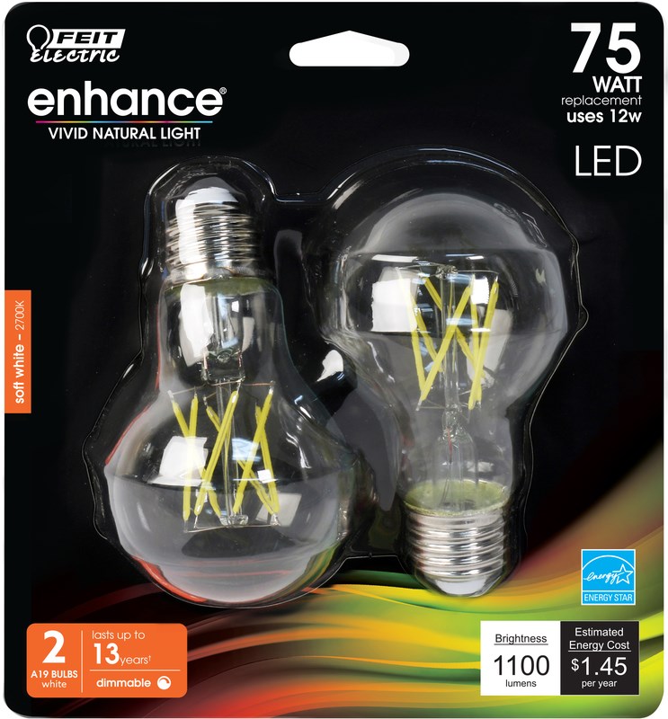 LED A19 FILAMENT BULB - 60W EQUIVALENT, 2-PACKFeit Electric A19 LED filament bulb combines innovative LED technology with classic filament strips, delivering the warm look of a traditional incandescent with the energy savings of LED. Uses just 12 watts to replace a traditional bulb. The medium (E26) base fits most standard household fixtures. Enjoy 1100 lumens of soft white light.