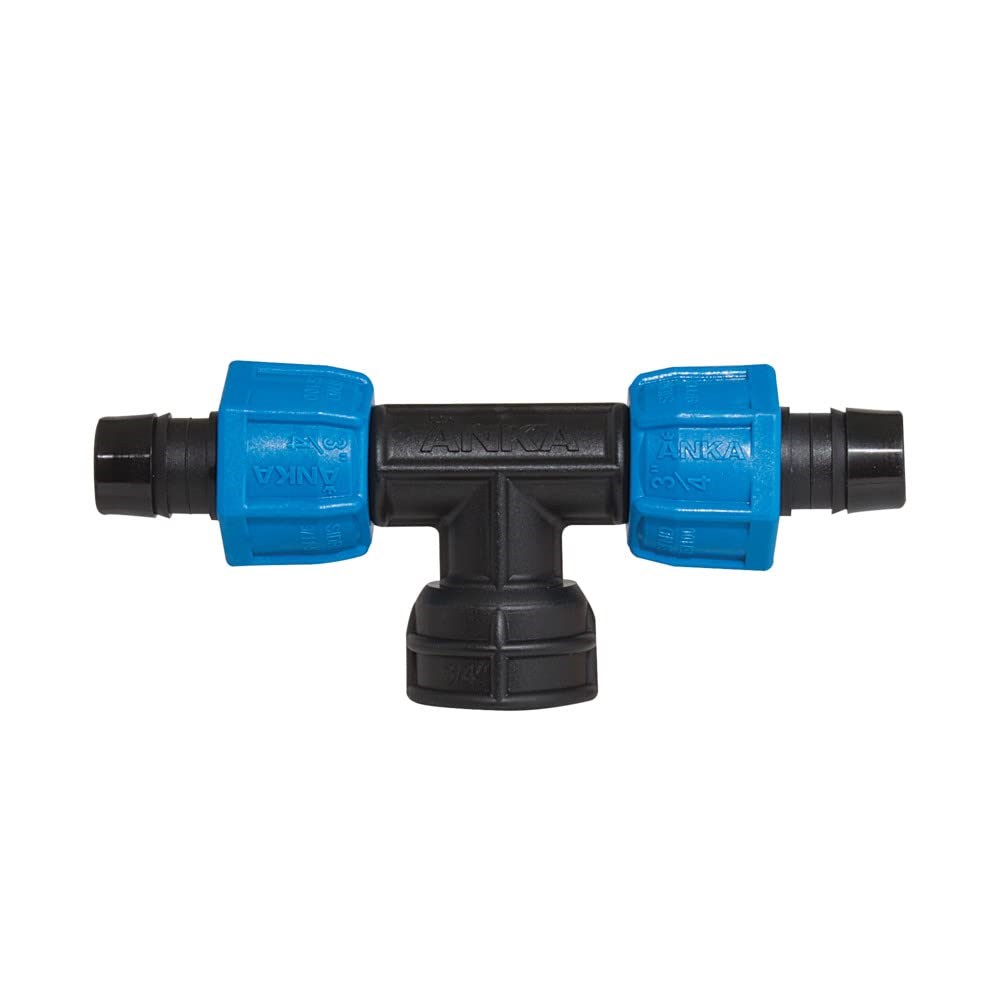 WATTS ANKA REINFORCED NYLON FEMALE TEE - 3/4"The Watts ANKA AFT34 female tee connects 3/4" polyethylene pipe, vinyl hose, or tubing with a leak-free barb-to-thread connection. Made from high-grade fiberglass reinforced nylon, this fitting handles up to 230 PSI at 68 deg F and temperatures up to 140 deg F. The unique blue captive tapered nut grips the pipe surface for a secure, reusable connection without special tools.