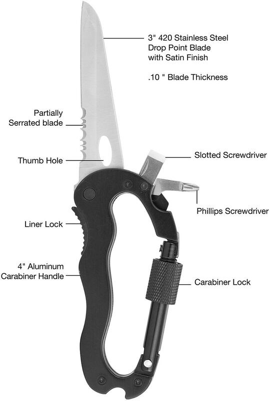 3" knife, slotted & phillips screwdriver and Carabiner clip